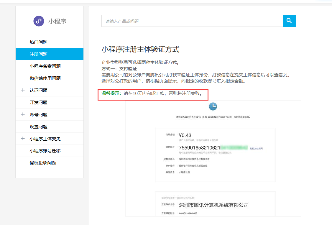 请问小程序认证的时候对公打款有时间限制吗?公司对公打款要走流程,担心这个时间不够