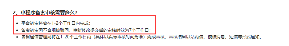 你好,目前该小程序备案进度提示为提交平台初审,小程序备案非首次提交,平台初审审核时长为7个工作日。请耐心等待审核,审核结果会以站内信、模板消息、短信等形式通知到小程序管理员。 在平台初审的过程中,请备案相关人员保持电话畅通,以便平台对你提交的备案信息进行核验。