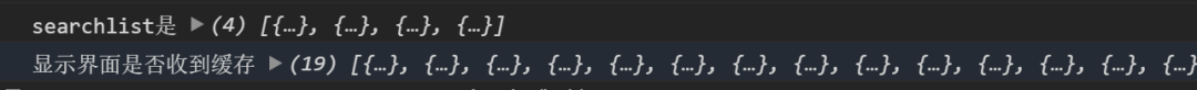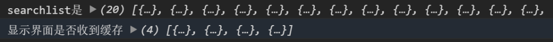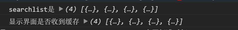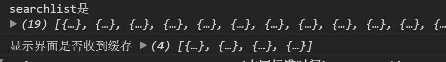 // miniprogram/pages/searchlist.jsvar searchstorage = wx.getStorageSync('searchlist');Page({ data: { listData: searchstorage }, onLoad: function (options) { console.log('显示界面是否收到缓存', searchstorage) }, |