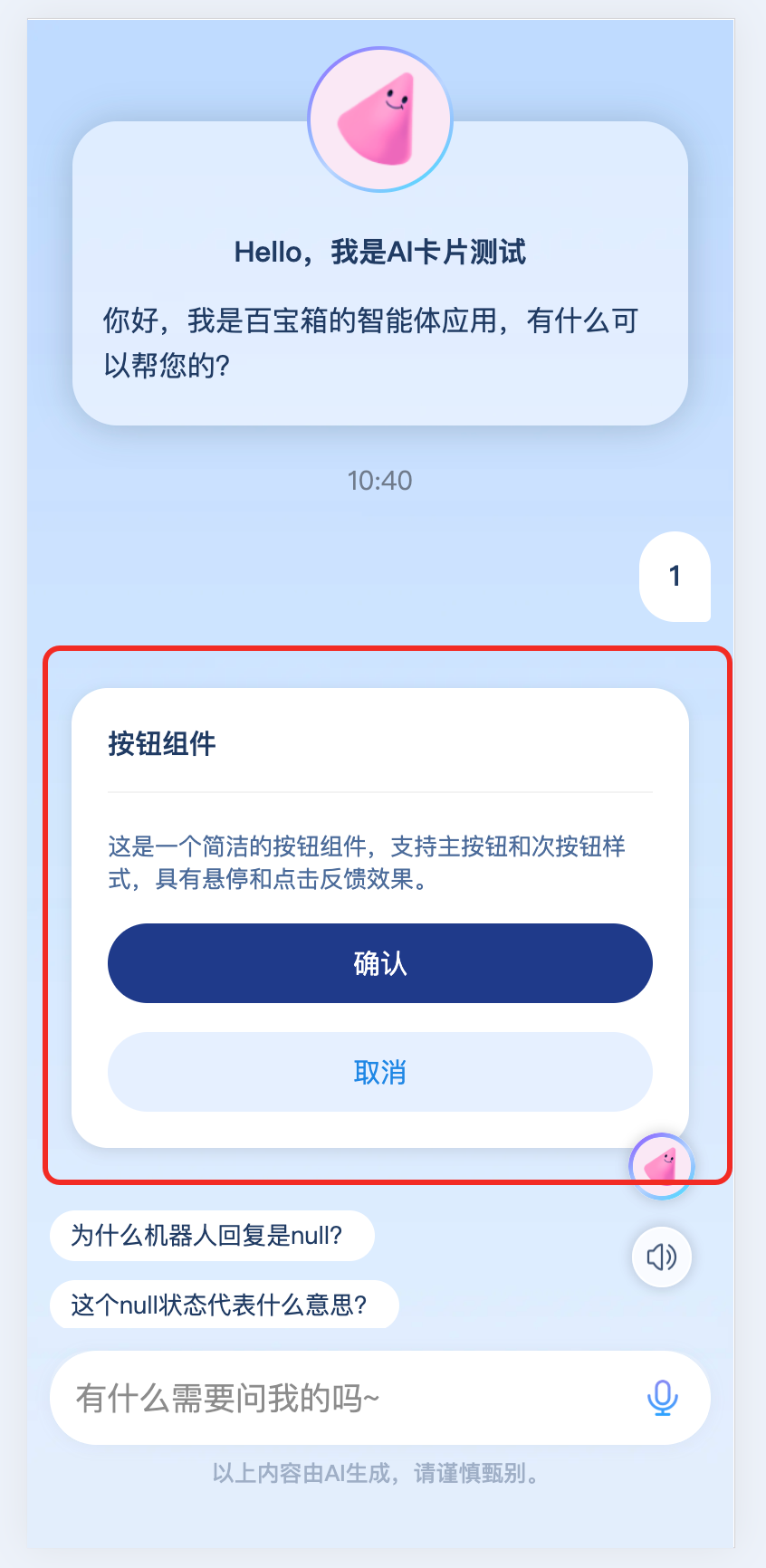 复现方式:用微信扫码进入页面,在底部对话框输入任意内容。正常情况下,应该有下面卡片,但是苹果手机无法显示。