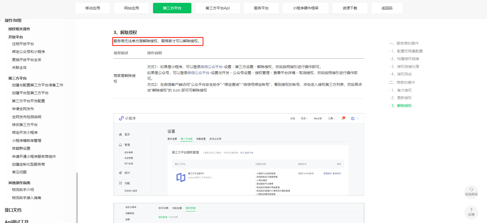 你好,https://developers.weixin.qq.com/doc/oplatform/Third-party_Platforms/2.0/operation/authorization/authorization_management.html#_3%E3%80%81%E8%A7%A3%E9%99%A4%E6%8E%88%E6%9D%83
