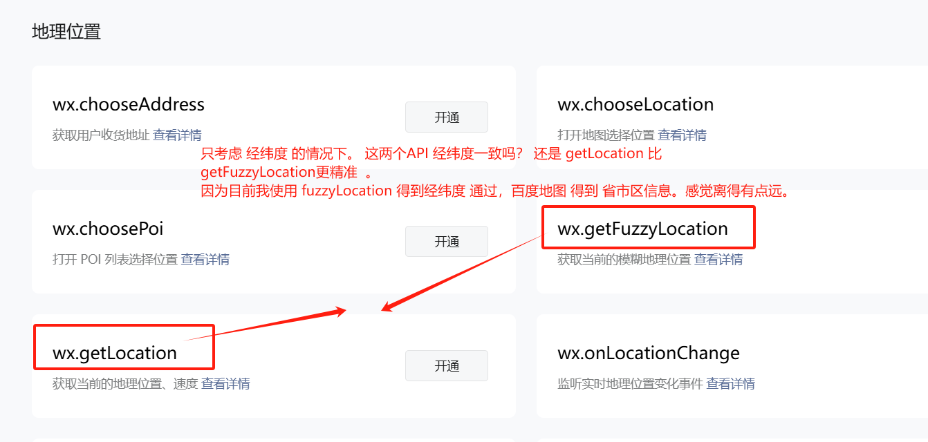 只考虑 '经纬度准确性' 的情况下。这两个API经纬度一致吗?还是 qetLocation 比getFuzzyLocation更精准因为目前我使用 fuzzyLocation 得到经纬度 通过,百度地图 得到 省市区信息。感觉离得有点远。