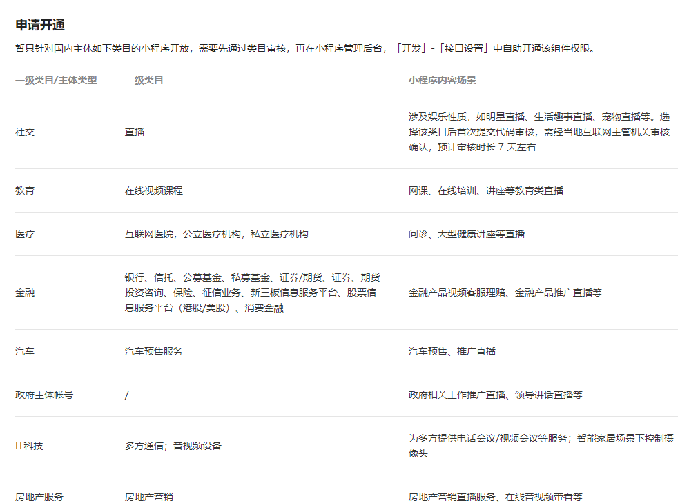 你好,我们小程序目前有如下类目,包含工具-视频客服。想开通live-player和live-pusher权限,用于小程序中与当事人进行实时视频调解。 请问要如何操作?