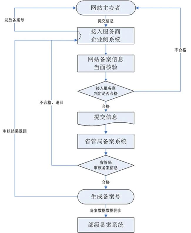 网站主办者委托接入服务商代为报备网站的全部备案信息并核实信息真伪->接入服务商核实备案信息->将备案信息提交到省管局系统。
