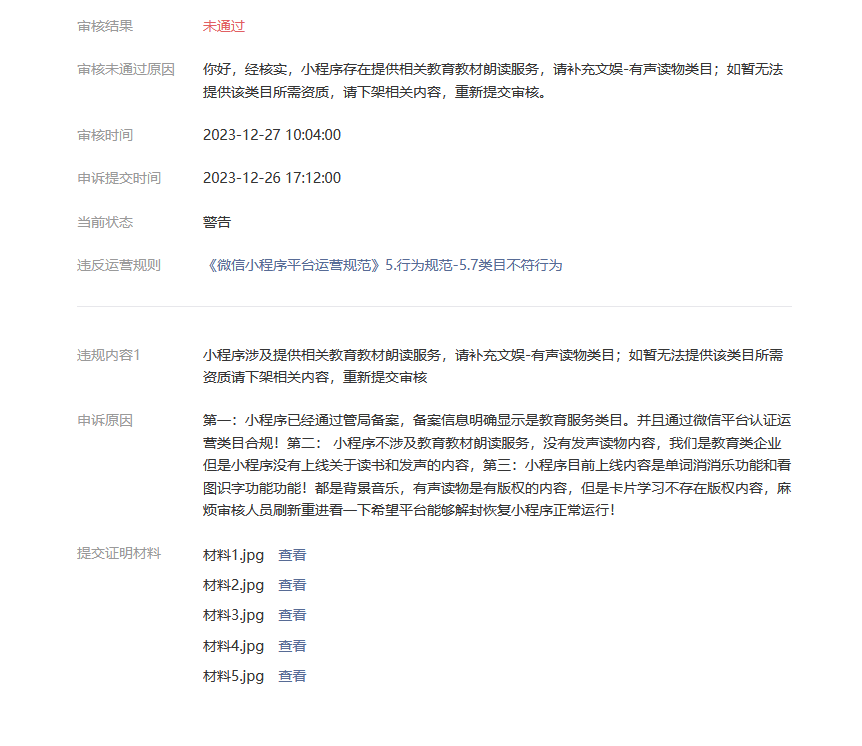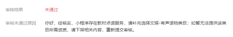 第二: 小程序不涉及教育教材朗读服务,没有发声读物内容,我们是教育类企业但是小程序没有上线关于读书和发声的内容,使用的功能都是没有版权的单词内容,不含读物教材小说等审核人员拒审时提到的服务。