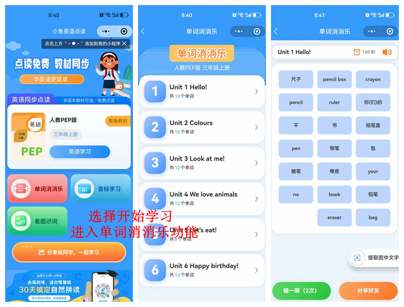 第三:小程序目前上线内容是单词消消乐功能和看图识字功能功能!都是背景音乐,有声读物是有版权的内容,但是卡片学习不存在版权内容,
