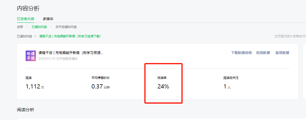 请问群发数据里面看到的阅读完成率和点进去之后完读率计算公式分别是什么?为什么完读率比阅读完成率低那么多。