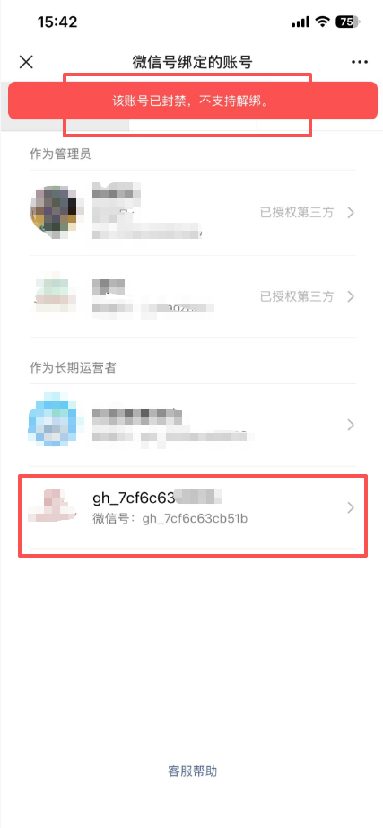 你好,公司的服务公众号迁移后,旧公众号被封禁了,没跟着解绑运营者身份,还绑定着原先运营者,无法解绑。目前占用了我一个位置,满足了1个微信号只能绑定5个账号的要求,请帮忙解绑下,我需要注册个新的公众号。