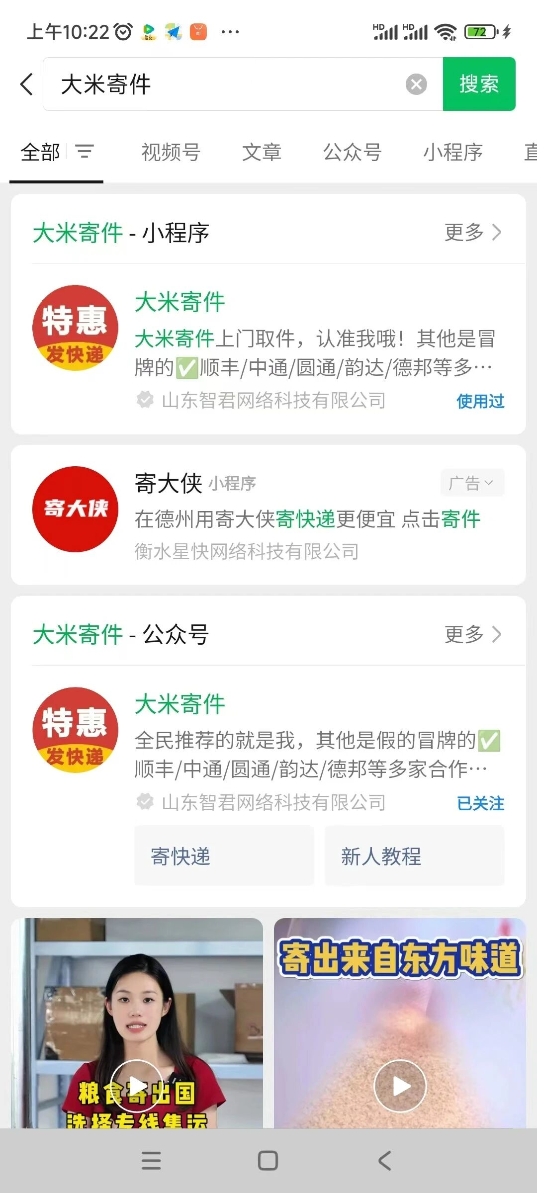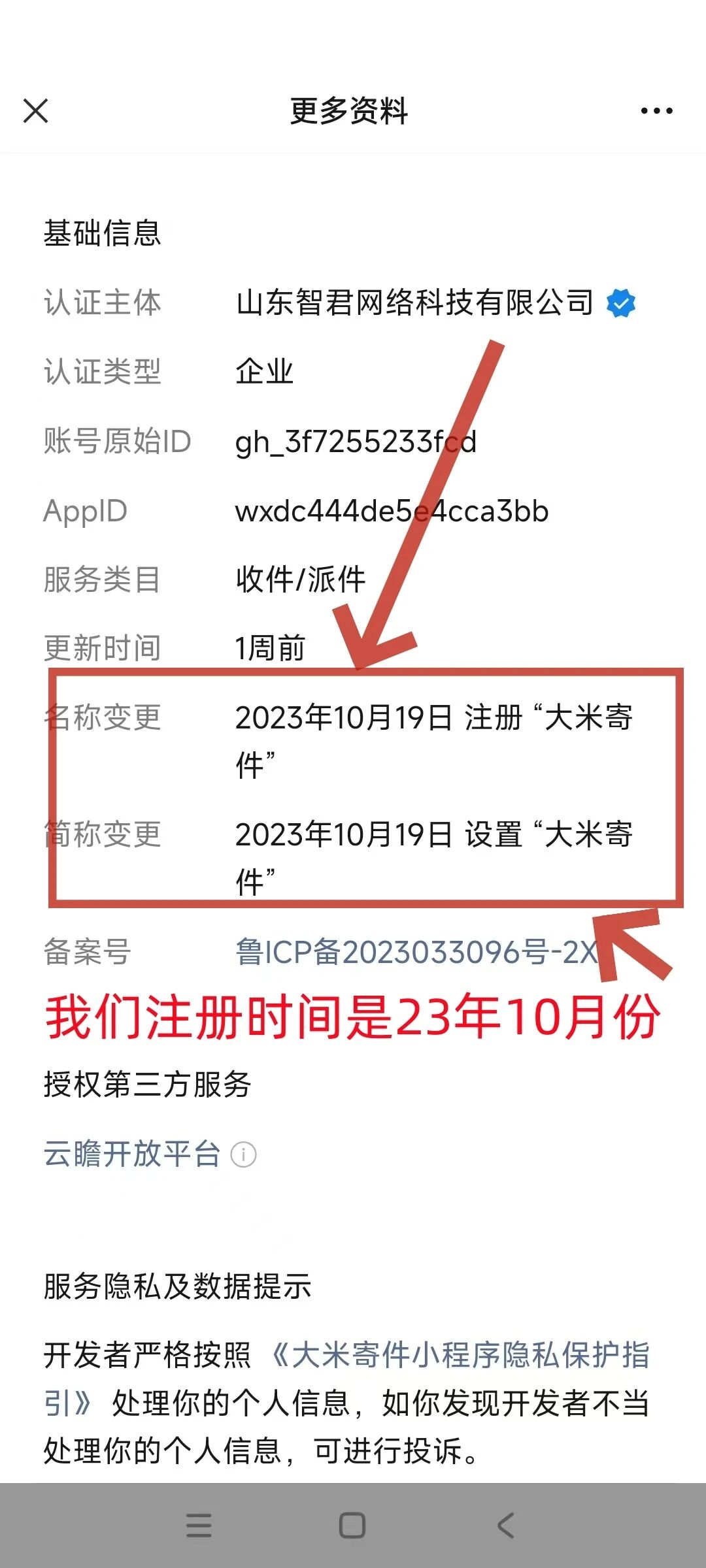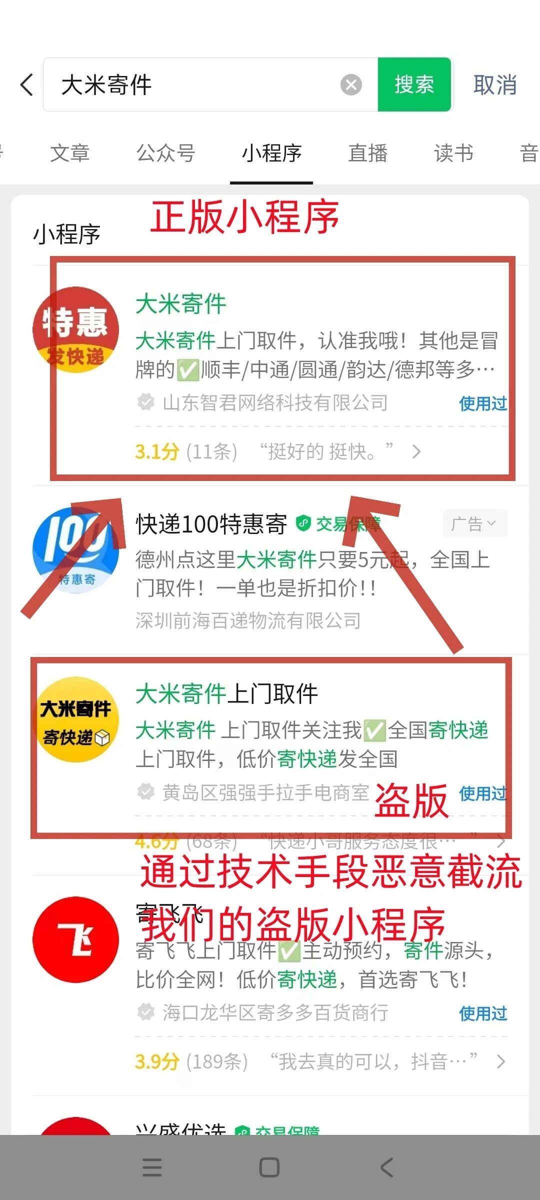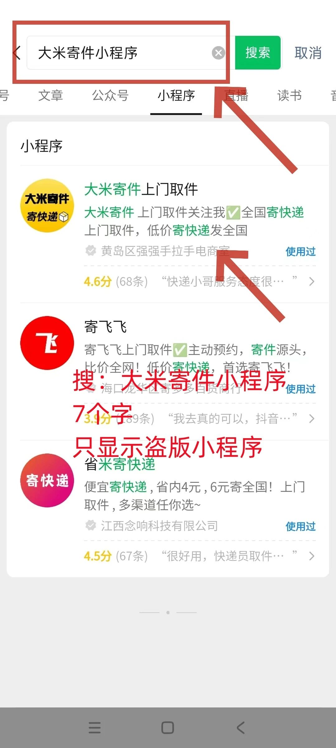 搜索:大米寄件小程序 这七个字搜出来的是模仿我的,显示的是这个盗版的