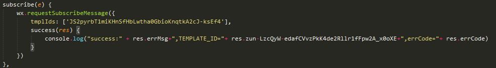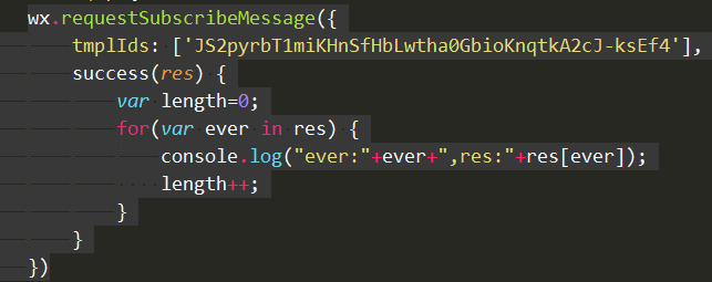 按照官方文档(文档链接),【[TEMPLATE_ID]是动态的键,即模板id.............例如 { errMsg: "requestSubscribeMessage:ok", zun-LzcQyW-edafCVvzPkK4de2Rllr1fFpw2A_x0oXE: "accept"} 表示用户同意订阅zun-LzcQyW-edafCVvzPkK4de2Rllr1fFpw2A_x0oXE这条消息】,按照object.success 回调函数参数Object res