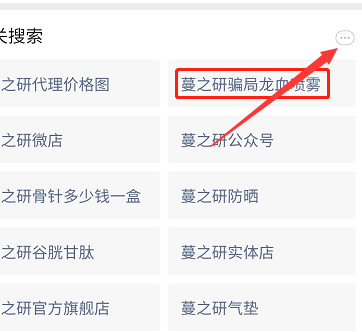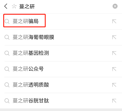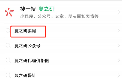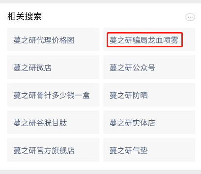 在搜一搜里 搜索“蔓之研”时出现相关搜索:蔓之研骗局、蔓之研骗局龙血喷雾