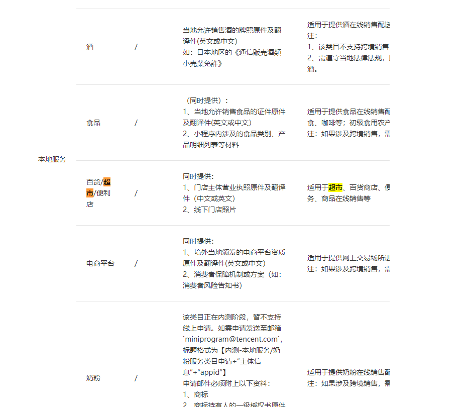 https://developers.weixin.qq.com/miniprogram/product/material/#%E5%A2%83%E5%A4%96%E4%B8%BB%E4%BD%93%E5%B0%8F%E7%A8%8B%E5%BA%8F%E5%BC%80%E6%94%BE%E7%9A%84%E6%9C%8D%E5%8A%A1%E7%B1%BB%E7%9B%AE