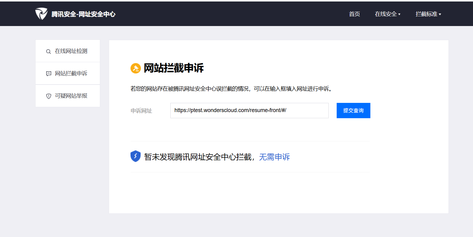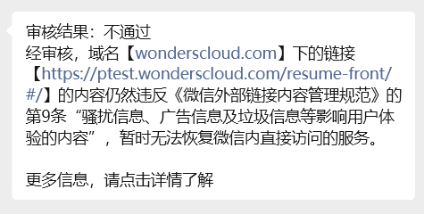 wonderscloud.com相关网址访问被拦截,申诉被驳回了,驳回原因是一个我们已经关闭互联访问的二级域名的地址,并且在腾讯安全中心检测也没问题,请人工处理给予解决方案,不要智能无脑回答!!!!!!!