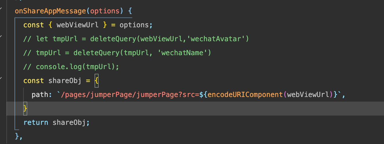 小程序中使用了web-view,打开了H5页面,通过window.location.href跳转一个第三方页面后,点击右上角分享,通过onShareAppMessage获取当前webViewUrl,当前页面链接为https://z.xxx.com.cn/a/b/list,获取webViewUrl在安卓手机上只返回了https://z.xxx.com.cn/遗失了后面的路由,IOS手机上能够获取完整链接。求助!