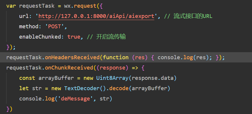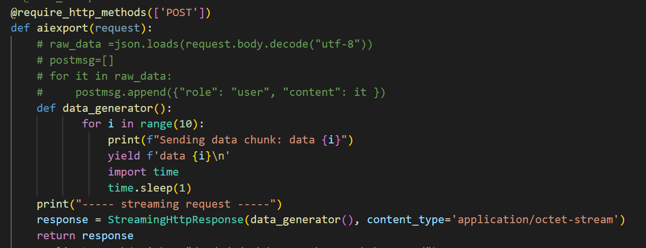 如图所以,微信流式请求,后端是python django的流式输出,content_type 也修改为 text/plain 尝试过
