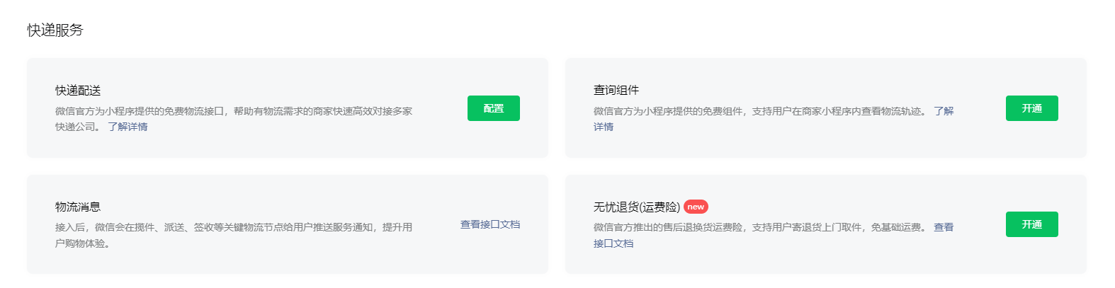 我开通了微信小程序,绑定了德邦物流,但是客户下单后只有快递单号,没有具体的物流信息。目前我只在物理服务中看到了四个配置,但是我不知道我要开通哪一个,以及需要哪些资料,该怎么进行操作?