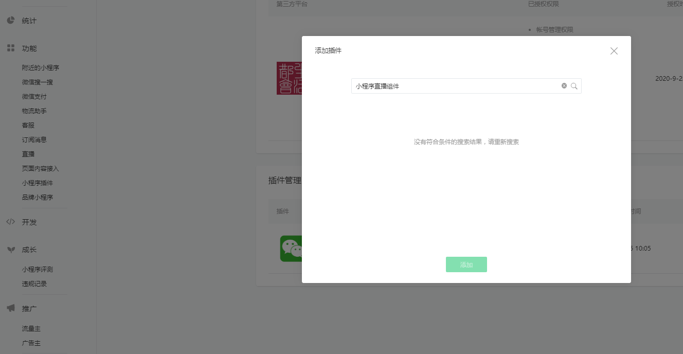满足准入要求及引入直播组件后,点击左边菜单“功能”板块中的“直播”即可开通