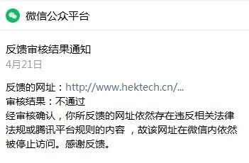你好,经核实,域名hektech.cn下的违规内容已经修改,现已恢复微信内直接访问的服务,请知悉。