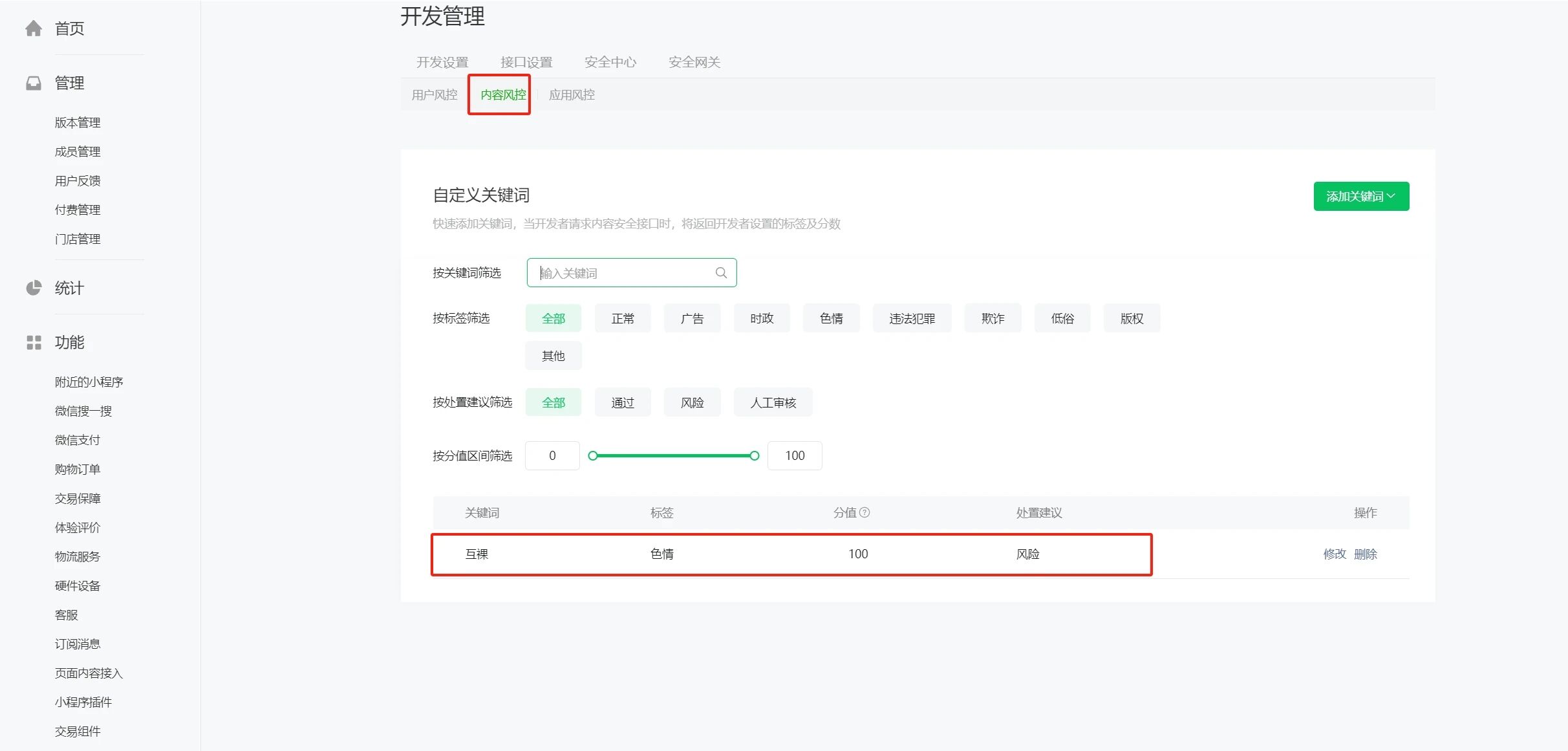 2.百度查询后,说可以自己添加,我将互裸添加到小程序后台安全中心里,再次测试内容安全识别接口,返回不是100了