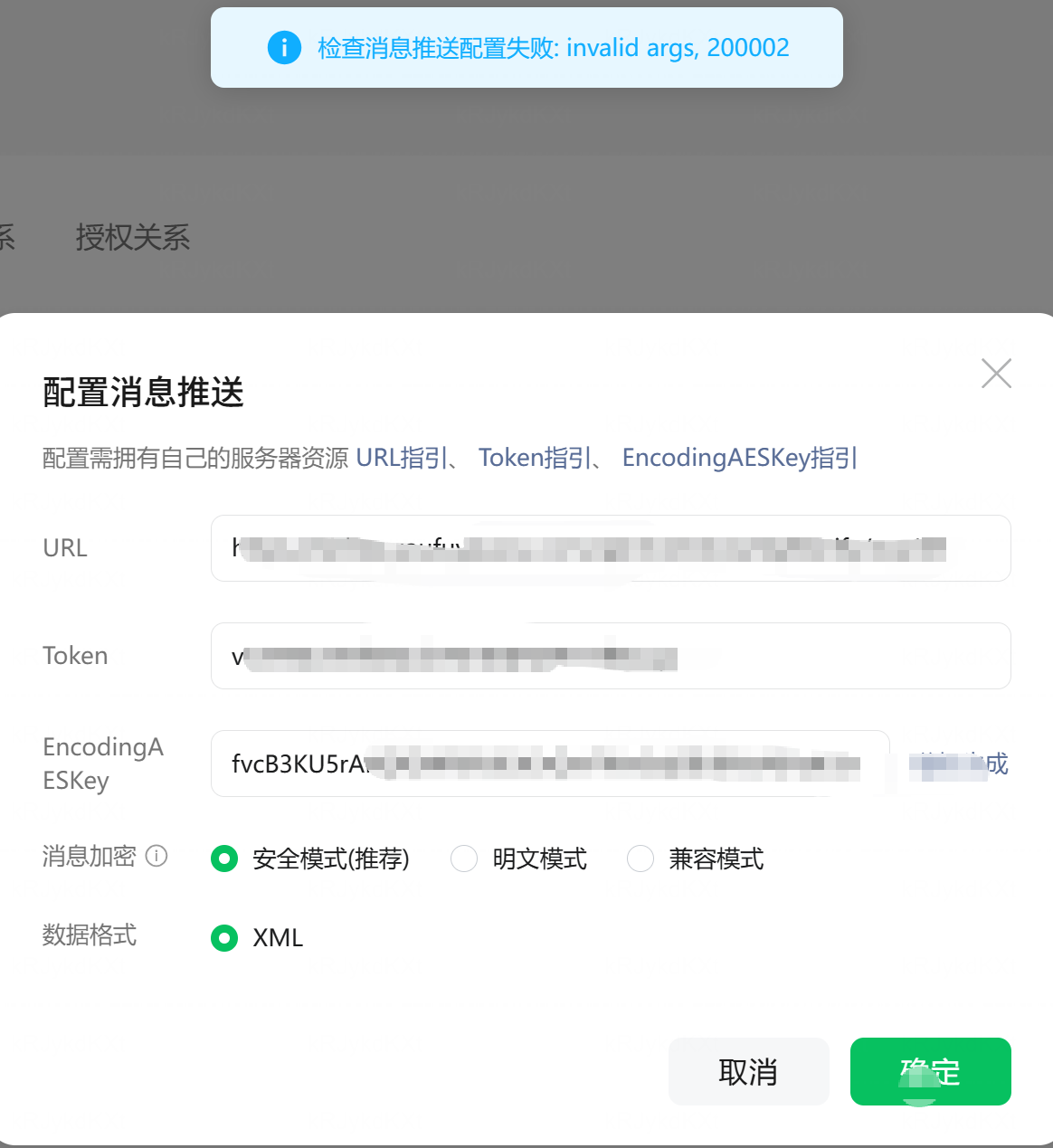 自从12月1日更新后就无法保存了、11月底还可以正常配置、而且点击确定是服务器没收到请求、服务器没做特殊限制、URL在微信也可以正常打开