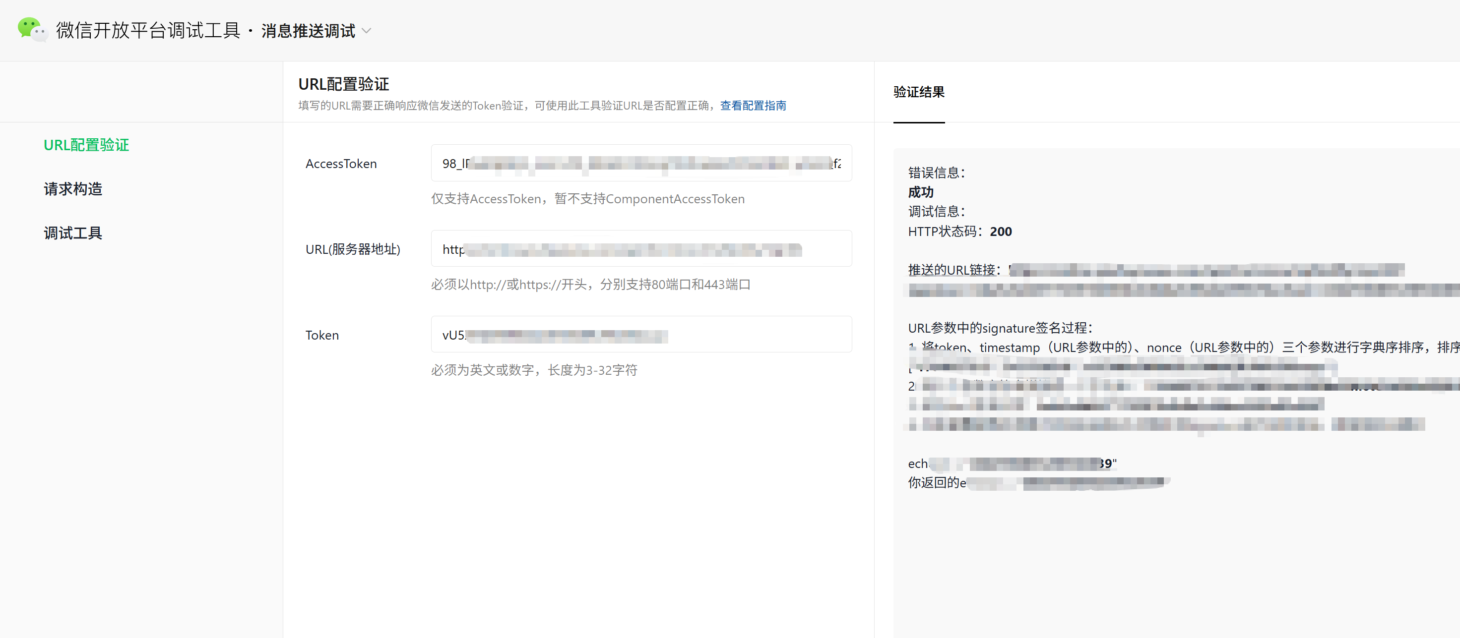 你好,开发者调试可以用官方工具试试: https://developers.weixin.qq.com/apiExplorer?type=messagePush