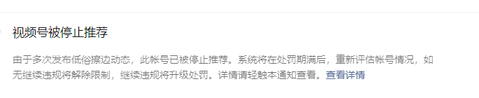 如图,2022年7约23日,因为发了三个动漫的视频被判定是低俗擦边动态,然后说是账号被停止推荐。想问问这个处罚是多久?多久可以重新评估账号情况,评估完没问题账号流量是否会被限制?