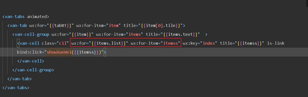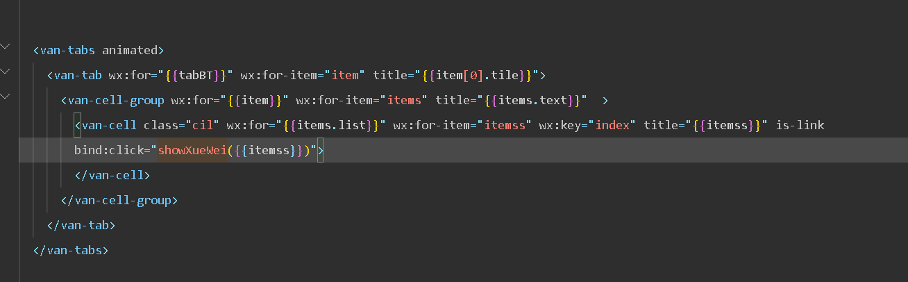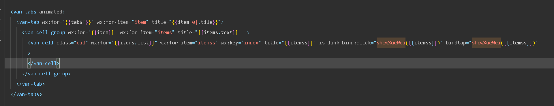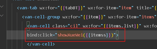 点击语法错误,点击事件替换成 bind:click="showXueWei" 试一下。