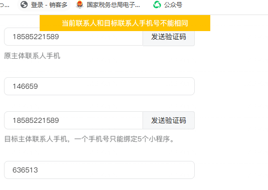 我在做小程序的主体变更,因为变更前后公司法人和管理员都是我本人,但是系统显示当前联系人和目标联系人手机号不能相同,因为特殊情况我想申请通过