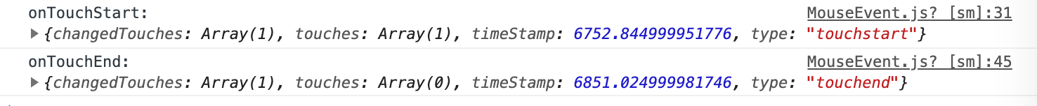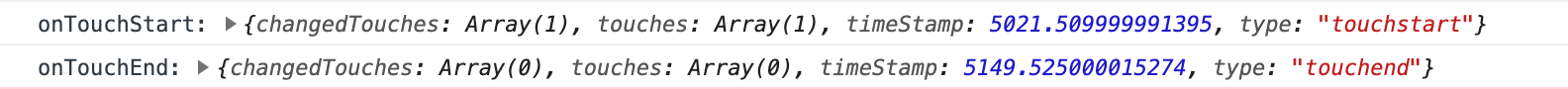 上图是真正的touch事件,touch start事件中的 event ,changedTouches和touches都有数据,touch end 事件中的 event,changedTouches有数据而touches无数据。