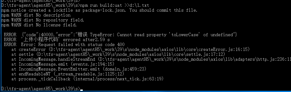 17:44:33 IDE server has started, listening on http://127.0.0.1:4596017:44:33 initialization finished17:44:33 uploading project...17:44:33 { i [StatusCodeError]: 400 - "{\"code\":40000,\"error\":\"错误 TypeError: Cannot read property 'toLowerCase' of undefined\"}"17:44:33 at new i (/Users/tinman/Library/Application Support/微信开发者工具/WeappCode/package.nw/js/common/cli/index.js:157:49969)17:44:33 at H.callback (/Users/tinman/Library/Application Support/微信开发者工具/WeappCode/package.nw/js/common/cli/index.js:157:48818)17:44:33 at H.e.callback.a.callback [as _callback] (/Users/tinman/Library/Application Support/微信开发者工具/WeappCode/package.nw/js/common/cli/index.js:157:47872)17:44:33 at H.a._callback.a.callback.a.callback (/Users/tinman/Library/Application Support/微信开发者工具/WeappCode/package.nw/js/common/cli/index.js:187:5433)17:44:33 at H.emit (events.js:193:13)17:44:33 at H.<anonymous> (/Users/tinman/Library/Application Support/微信开发者工具/WeappCode/package.nw/js/common/cli/index.js:187:18246)17:44:33 at H.emit (events.js:193:13)17:44:33 at IncomingMessage.<anonymous> (/Users/tinman/Library/Application Support/微信开发者工具/WeappCode/package.nw/js/common/cli/index.js:187:17088)17:44:33 at Object.onceWrapper (events.js:281:20)17:44:33 at IncomingMessage.emit (events.js:198:15)17:44:33 name: 'StatusCodeError',17:44:33 statusCode: 400,17:44:33 message:17:44:33 `400 - "{\\"code\\":40000,\\"error\\":\\"错误 TypeError: Cannot read property 'toLowerCase' of undefined\\"}"`,17:44:33 error:17:44:33 `{"code":40000,"error":"错误 TypeError: Cannot read property 'toLowerCase' of undefined"}`,17:44:33 options:17:44:33 { url:17:44:33 'http://127.0.0.1:45960/upload?cli=1&projectpath=%252FUsers%252Ftinman%252Fjenkins_workspace%252Fworkspace%252Fjojo_new_read&version=1.29.0.258&desc=build&infooutput=',17:44:33 resolveWithFullResponse: true,17:44:33 proxy: false,17:44:33 callback: [Function],17:44:33 transform: undefined,17:44:33 simple: true,17:44:33 transform2xxOnly: false },17:44:33 response:17:44:33 IncomingMessage {17:44:33 _readableState:17:44:33 ReadableState {17:44:33 objectMode: false,17:44:33 highWaterMark: 16384,17:44:33 buffer: BufferList { head: null, tail: null, length: 0 },17:44:33 length: 0,17:44:33 pipes: null,17:44:33 pipesCount: 0,17:44:33 flowing: true,17:44:33 ended: true,17:44:33 endEmitted: true,17:44:33 reading: false,17:44:33 sync: true,17:44:33 needReadable: false,17:44:33 emittedReadable: false,17:44:33 readableListening: false,17:44:33 resumeScheduled: false,17:44:33 paused: false,17:44:33 emitClose: true,17:44:33 autoDestroy: false,17:44:33 destroyed: false,17:44:33 defaultEncoding: 'utf8',17:44:33 awaitDrain: 0,17:44:33 readingMore: true,17:44:33 decoder: null,17:44:33 encoding: null },17:44:33 readable: false,17:44:33 _events:17:44:33 [Object: null prototype] {17:44:33 end: [Array],17:44:33 close: [Array],17:44:33 data: [Function],17:44:33 error: [Function] },17:44:33 _eventsCount: 4,17:44:33 _maxListeners: undefined,17:44:33 socket:17:44:33 Socket {17:44:33 connecting: false,17:44:33 _hadError: false,17:44:33 _parent: null,17:44:33 _host: null,17:44:33 _readableState: [ReadableState],17:44:33 readable: true,17:44:33 _events: [Object],17:44:33 _eventsCount: 7,17:44:33 _maxListeners: undefined,17:44:33 _writableState: [WritableState],17:44:33 writable: false,17:44:33 allowHalfOpen: false,17:44:33 _sockname: null,17:44:33 _pendingData: null,17:44:33 _pendingEncoding: '',17:44:33 server: null,17:44:33 _server: null,17:44:33 parser: null,17:44:33 _httpMessage: [ClientRequest],17:44:33 [Symbol(asyncId)]: 35,17:44:33 [Symbol(kHandle)]: [TCP],17:44:33 [Symbol(lastWriteQueueSize)]: 0,17:44:33 [Symbol(timeout)]: null,17:44:33 [Symbol(kBytesRead)]: 0,17:44:33 [Symbol(kBytesWritten)]: 0 },17:44:33 connection:17:44:33 Socket {17:44:33 connecting: false,17:44:33 _hadError: false,17:44:33 _parent: null,17:44:33 _host: null,17:44:33 _readableState: [ReadableState],17:44:33 readable: true,17:44:33 _events: [Object],17:44:33 _eventsCount: 7,17:44:33 _maxListeners: undefined,17:44:33 _writableState: [WritableState],17:44:33 writable: false,17:44:33 allowHalfOpen: false,17:44:33 _sockname: null,17:44:33 _pendingData: null,17:44:33 _pendingEncoding: '',17:44:33 server: null,17:44:33 _server: null,17:44:33 parser: null,17:44:33 _httpMessage: [ClientRequest],17:44:33 [Symbol(asyncId)]: 35,17:44:33 [Symbol(kHandle)]: [TCP],17:44:33 [Symbol(lastWriteQueueSize)]: 0,17:44:33 [Symbol(timeout)]: null,17:44:33 [Symbol(kBytesRead)]: 0,17:44:33 [Symbol(kBytesWritten)]: 0 },17:44:33 httpVersionMajor: 1,17:44:33 httpVersionMinor: 1,17:44:33 httpVersion: '1.1',17:44:33 complete: true,17:44:33 headers:17:44:33 { 'content-type': 'application/json; charset=utf-8',17:44:33 date: 'Thu, 21 Nov 2019 09:44:33 GMT',17:44:33 connection: 'close',17:44:33 'transfer-encoding': 'chunked' },17:44:33 rawHeaders:17:44:33 [ 'Content-Type',17:44:33 'application/json; charset=utf-8',17:44:33 'Date',17:44:33 'Thu, 21 Nov 2019 09:44:33 GMT',17:44:33 'Connection',17:44:33 'close',17:44:33 'Transfer-Encoding',17:44:33 'chunked' ],17:44:33 trailers: {},17:44:33 rawTrailers: [],17:44:33 aborted: false,17:44:33 upgrade: false,17:44:33 url: '',17:44:33 method: null,17:44:33 statusCode: 400,17:44:33 statusMessage: 'Bad Request',17:44:33 client:17:44:33 Socket {17:44:33 connecting: false,17:44:33 _hadError: false,17:44:33 _parent: null,17:44:33 _host: null,17:44:33 _readableState: [ReadableState],17:44:33 readable: true,17:44:33 _events: [Object],17:44:33 _eventsCount: 7,17:44:33 _maxListeners: undefined,17:44:33 _writableState: [WritableState],17:44:33 writable: false,17:44:33 allowHalfOpen: false,17:44:33 _sockname: null,17:44:33 _pendingData: null,17:44:33 _pendingEncoding: '',17:44:33 server: null,17:44:33 _server: null,17:44:33 parser: null,17:44:33 _httpMessage: [ClientRequest],17:44:33 [Symbol(asyncId)]: 35,17:44:33 [Symbol(kHandle)]: [TCP],17:44:33 [Symbol(lastWrite