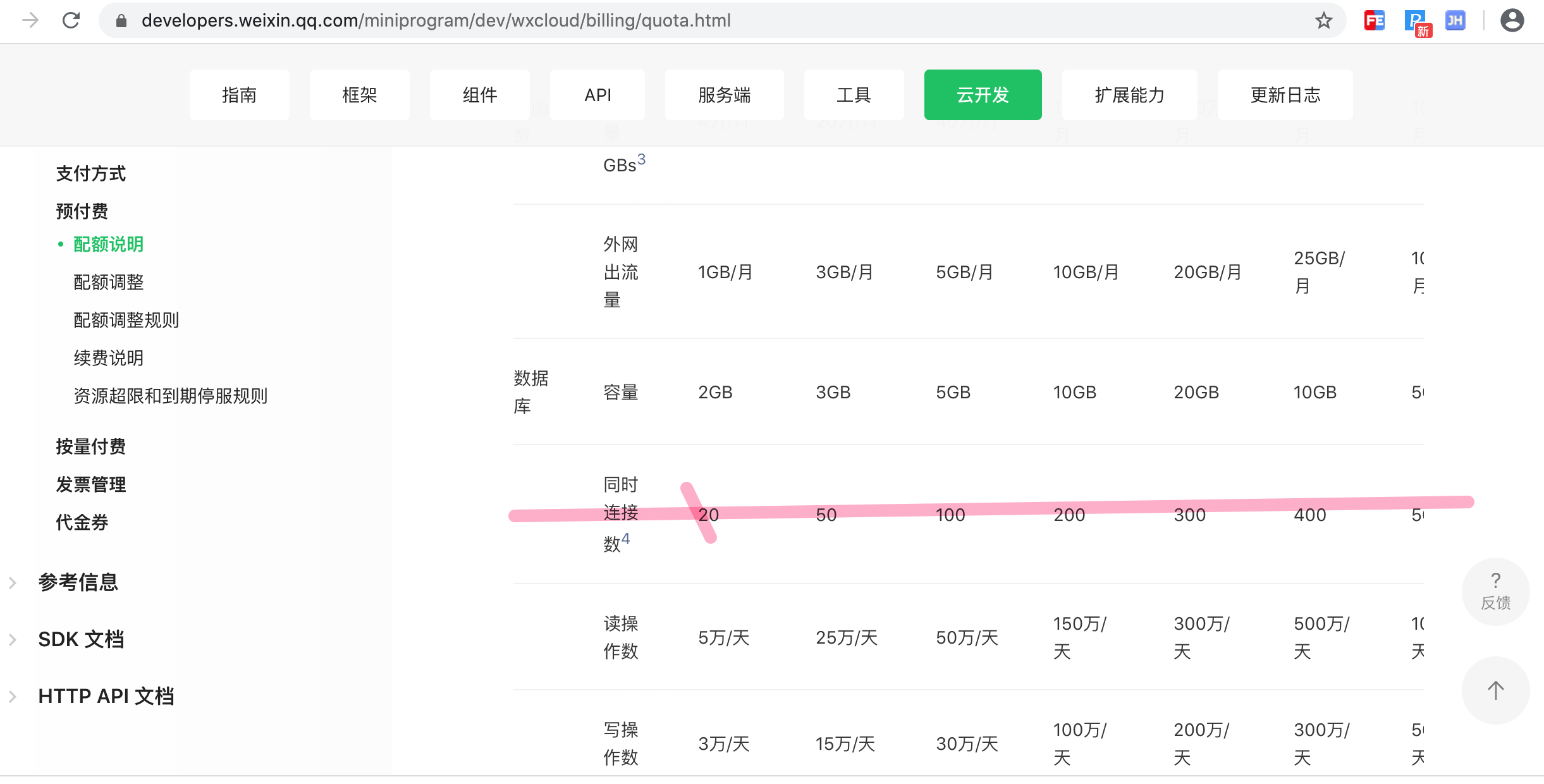数据库同时连接数 :数据库请求并发数量,如同时有三十个数据库操作请求,则有二十个会同时执行,剩下十个返回超出并发错误;一次数据库请求(无论小程序端发起还是云函数端发起)将耗费一个连接;每个云环境分别有一个同时连接数限制、独立计数。假如数据库查询平均耗时 10ms,那么一个连接可以支持 100qps(1000ms/10ms=100),20个连接可以支持到 2000qps。