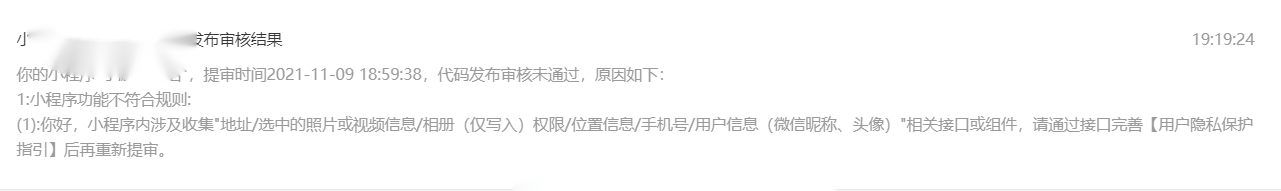 小程序涉及到收集用户个人隐私信息,需要完善好用户隐私保护指引,且必须认真填,因为该《用户隐私保护》的信息能通过查看小程序时查看到,所以开发者不要将开发者自己的个人隐私信息写到用户隐私保护上,例如:有bug请联系手机:xxxxxxxx