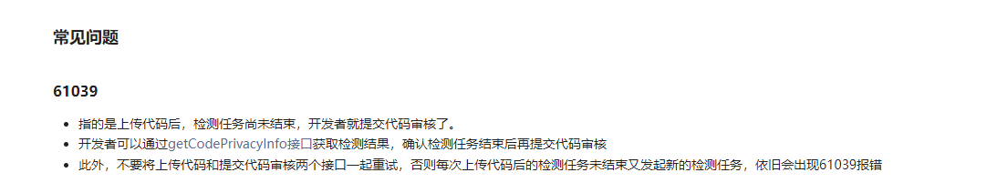 APPID:wx840fb5ee0398f4ec 提交 ,报错:将第三方提交的代码包提交审核失败!errcode=61039,errmsg = ,隐私接口检查任务未完成,请稍等一分钟再重试 rid: 675774c9-572f8899-6d766993 麻烦协助处理下 谢谢