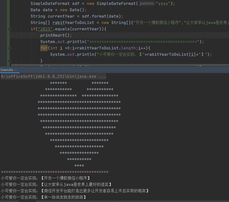 System.out.println("小可爱你一定会实现:【"+rabitYearToDoList[i]+"】");