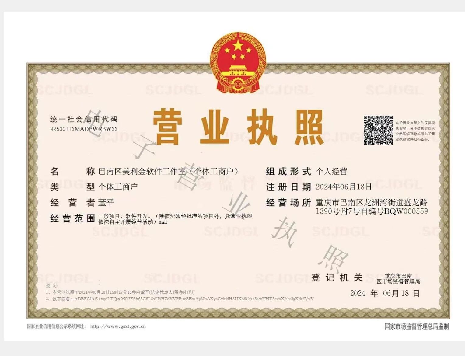 营业执照:巴南区美利金软件工作室(个体工商户)