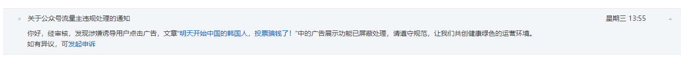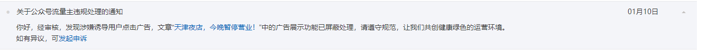今天收到这个信息,但是我们从来没有诱导用户点击底部广告,无论是文字的还是图片的都没有过,只是这一个信息发给我们就封了,真的很冤屈, 不知道有什么渠道能知道到底是哪里或者哪个文章违规了呢???总该让人死个明白吧?求解(ID :wxdba38e587023ef12)