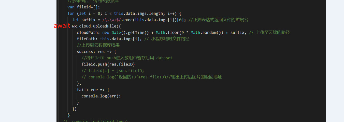 问题已经解决,上传图片时,由于是默认异步进行,通过upload 返回的时候,他是异步执行,没等返回结果赋值给数组他就执行下一步了,需要使用async await来对函数进行同步执行有 async function(){} 与 name:async function(){}两种用法。upload函数前面加上await,还有要注意!!!对Callback 风格不支持,要用Promise 风格,感谢
