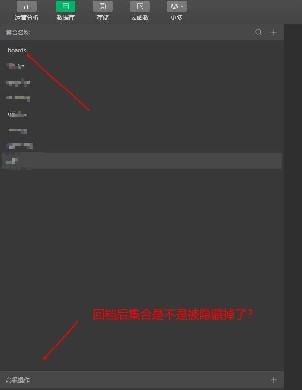 数据库回档后,回档集合(xxx_bak)在集合列表栏显示不出来。回档了好几次都没有。但偶然在切换到别的云环境再切换回来的时候,看到集合列表栏显示了下回档后的集合,但很快就消失了。是不是界面布局问题,把回档的隐藏掉了?