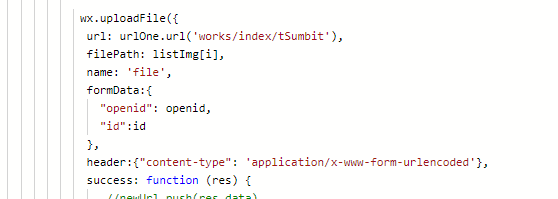 这段代码是我参考了许多代码后可以说是拼凑起来的,有的地方也不是很明白,比如 name: ' ',里边我应该写什么,我知道他是文件对应的 key , 开发者在服务器端通过这个 key 可以获取到文件二进制内容,但是不明白这具体是什么,和wxml代码里边有没有什么关联。还有formdata{ }里边应该怎么写, 这段代码中的URL因为我没有配置域名,所以勾选的不校验合法域名。