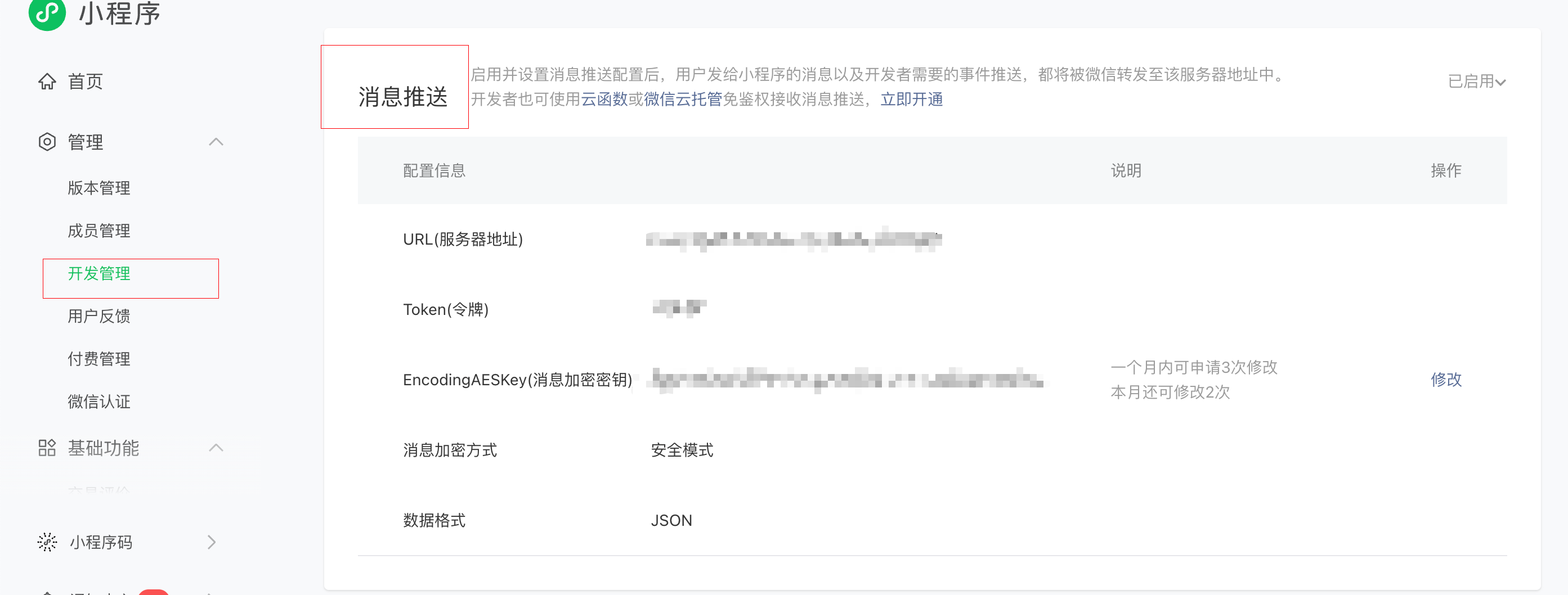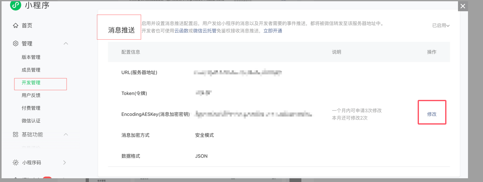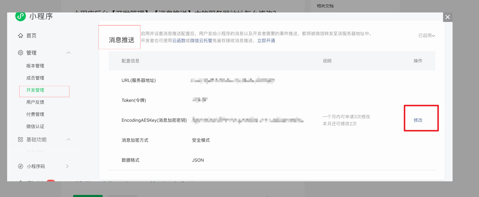 我在服务端调用内容安全校验的多媒体接口,需要开启消息推送功能接收校验结果。开发的时候配置的是测试服务器的地址,上线前发现没有地方修改服务器地址,右边的按钮只能关闭和开启,如下图。请问怎么解决。