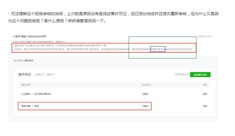 - 无法理解这个拒绝审核的说明,上次就是原因没有食品经营许可证,但已添加完成并且提交重新审核,但为什么又是因为这个问题拒绝呢?是什么原因?麻烦请管理员回一下。
