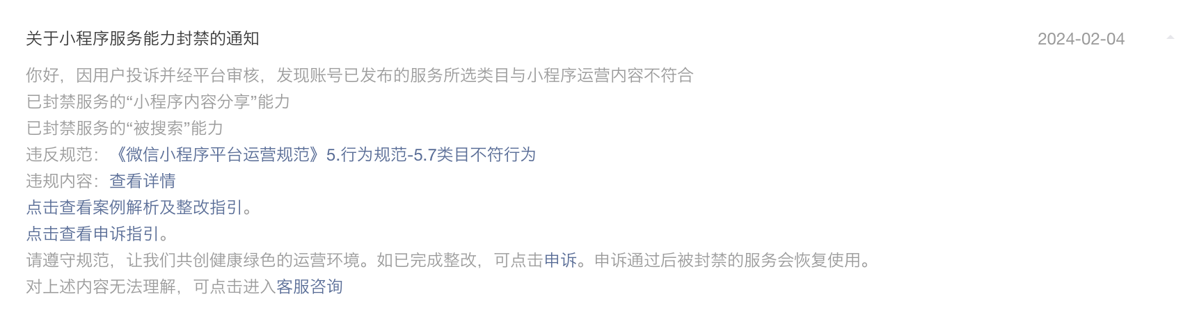 问题:我们在没有提示的情况下直接封禁了分享和被搜索的能力,原因是之前“申诉通过”的问题:再次“被”不符合5.7类目规范。