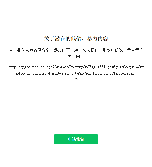 你好,经核实域名yjzc.net.cn下的链接【http://yjzc.net.cn/ijc73xbt0ca7v2vvny3h87kjkx56lxgew6g/fd3nnjrb0/hts45ow5f/kdb8h2owlhkz0enj7284d8e9iw9cswhr5oncdjb?lang=zhcn20】违规内容已经修改,现已恢复微信内直接访问的服务,请知悉。