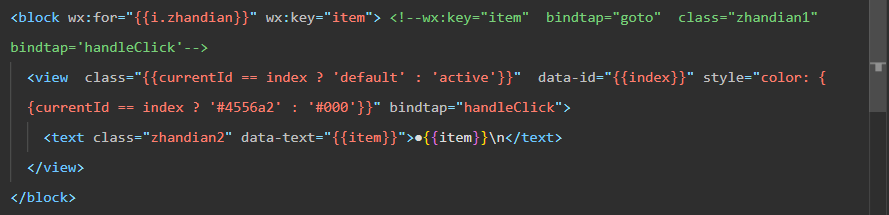 // page.wxml <view class="{{currentId == index ? 'default' : 'active'}}" wx:for="{{list}}" wx:key="index" data-id="{{index}}" bindtap="handleClick">{{item}}</view> // page.js data: { list: ["小程序", "小游戏", "小商店", "公众号"], currentId: null }, handleClick (e) { this.setData({ currentId: e.currentTarget.dataset.id }); } style="color: {{currentId == index ? '#4556a2' : '#000'}}" // 这样也行点击的时候获取索引,然后超级下索引信息匹配上的添加个class