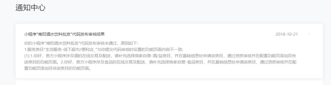 1.你好,经核实,贵方小程序最新提审版本涉及食品、酒的在线销售和配送,需补充商家自营-食品和商家自营-酒/盐类目,请在原有类目基础上补充商家自营-酒/盐类目,并在基础信息处申请该类目,通过资质审核并在配置功能页添加符合该类目的功能页面。2.