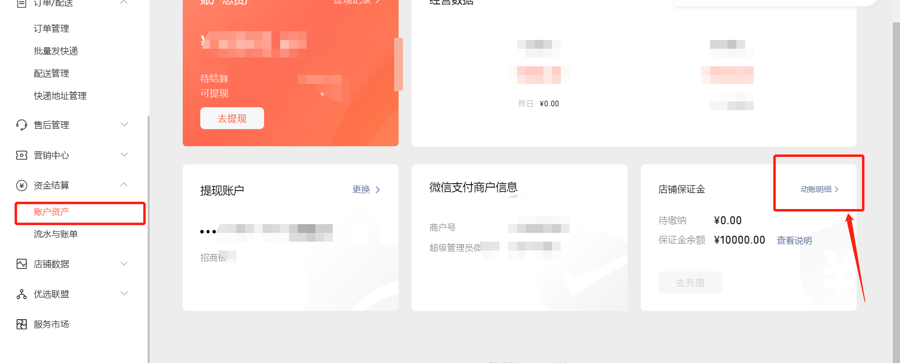 支付后48小时开票据,在账户资产,店铺保证金,查看明细可以开