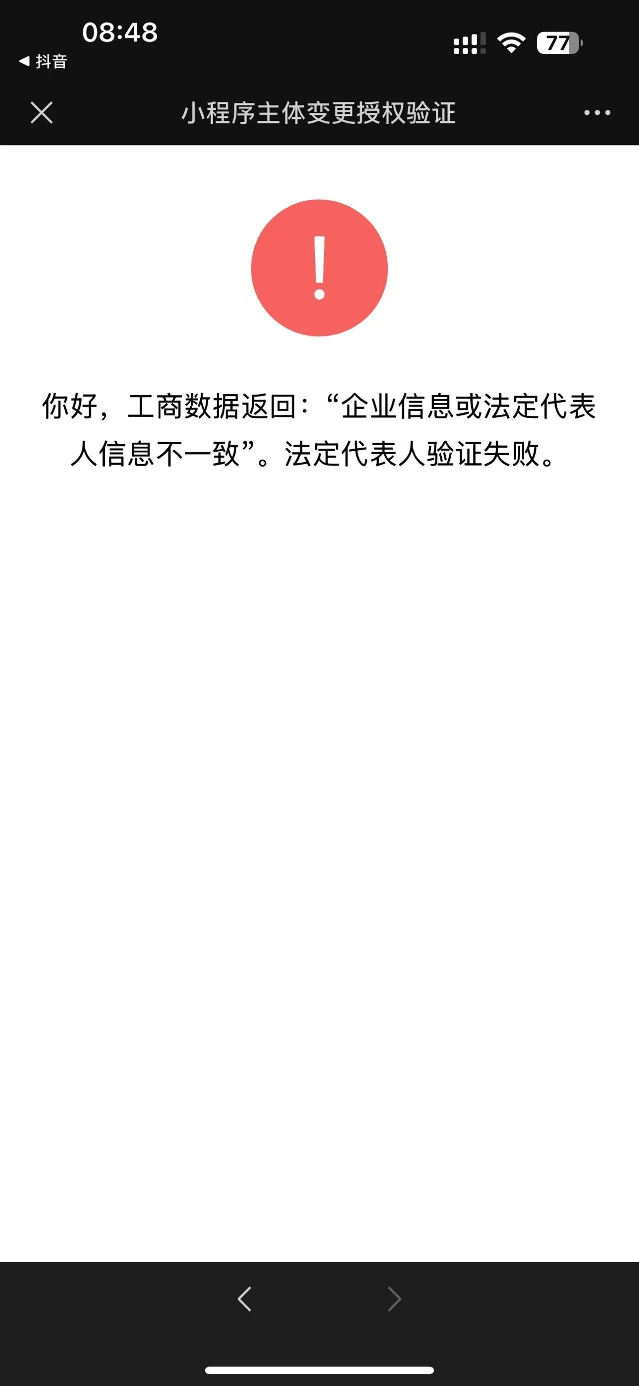由于法人没变,迁移主体第三步法人扫码验证的时候,提示【你好,工商数据返回:“企业信息或法定代表人信息不一致”。法定代表人验证失败。】