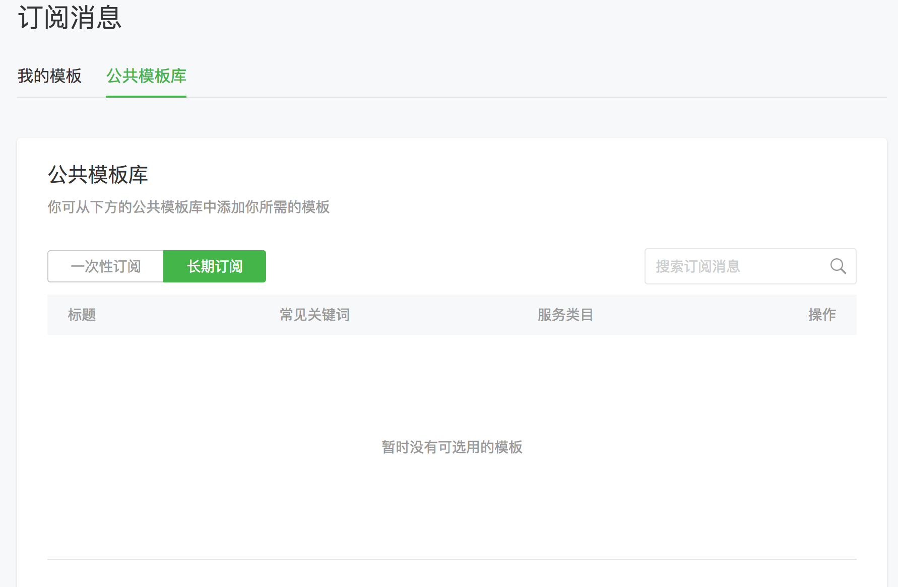 你好,目前长期性订阅消息仅向政务民生、医疗、交通、金融、教育等线下公共服务开放,后期将逐步支持到其他线下公共服务业务。长期订阅消息目前暂不支持线上申请新增模板,开发者可在社区论坛详细列举说明需求场景,后台后续进行评估,是否新增入库。