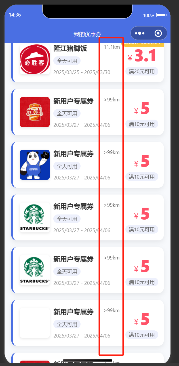 我的小程序需要根据用户的位置计算用户和不同商家的距离,然后根据距离展示不同商家的优惠券,方便用户到店后可以快速的找到对应门店的优惠券进行使用: