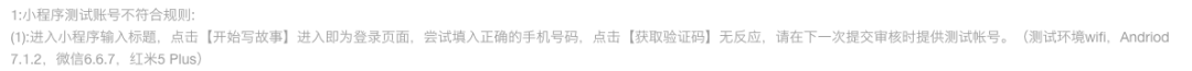 如上图,我们发表的小程序需要手机号+验证码登录,多次测试并无问题,可是提交审核了三次,测试人员都无法收到验证码,能不能提供手机号让我们排查一下问题,或者给个能提供测试账号的入口啊,现在提交审核就没有能填写备注的地方,求助